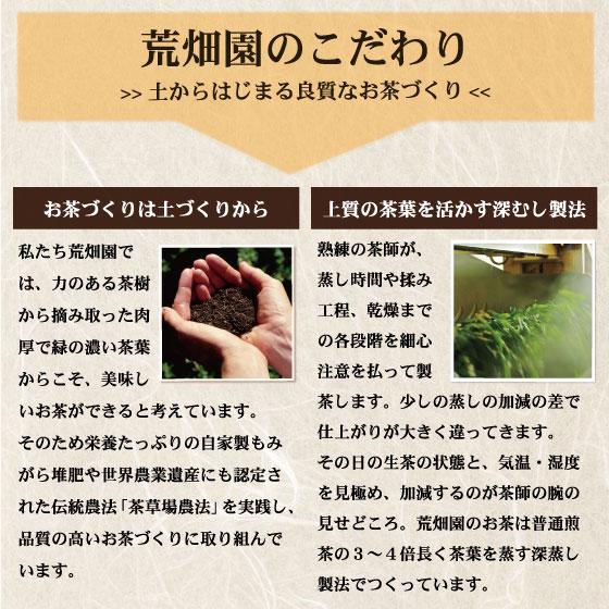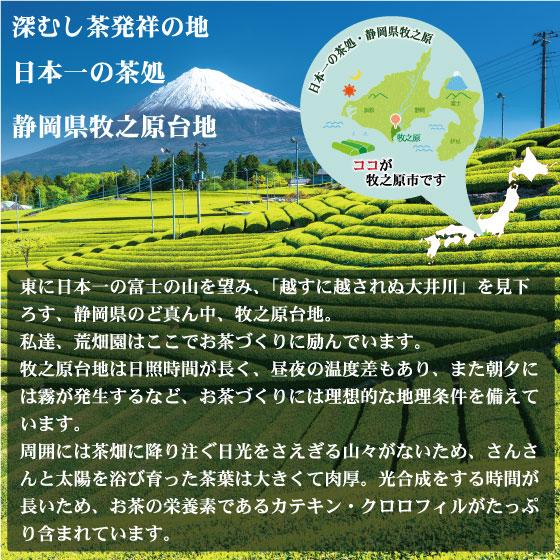 お茶処「静岡牧之原」で生産から製造まですべて自社一貫体制をしております。 世界農業遺産に登録された、昔ながらの「静岡の茶草場農法」を取り入れた、 自然還元農法でつくった深むし茶です。