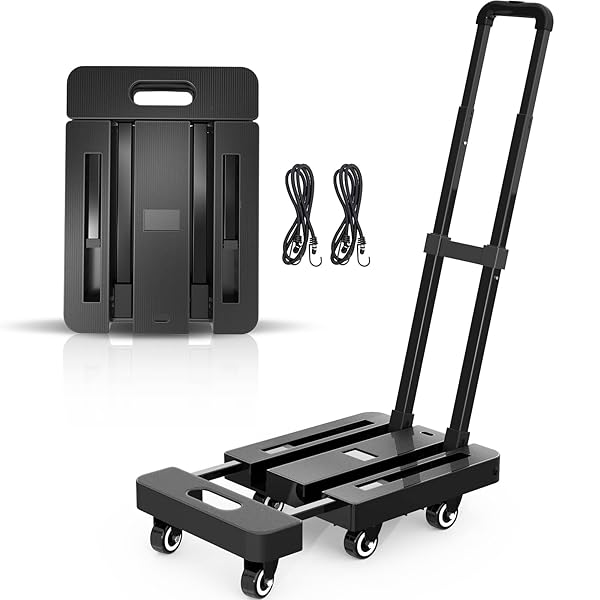 SPACEKEEPER キャリーカート 折りたたみ台車 耐荷重200KG 軽量 静音 小型 コンパクト 手押し台車 伸縮荷台 固定ロープ付き 運びに便利 (延長型) ブラック[31.5cmx43.8-57.5cm]