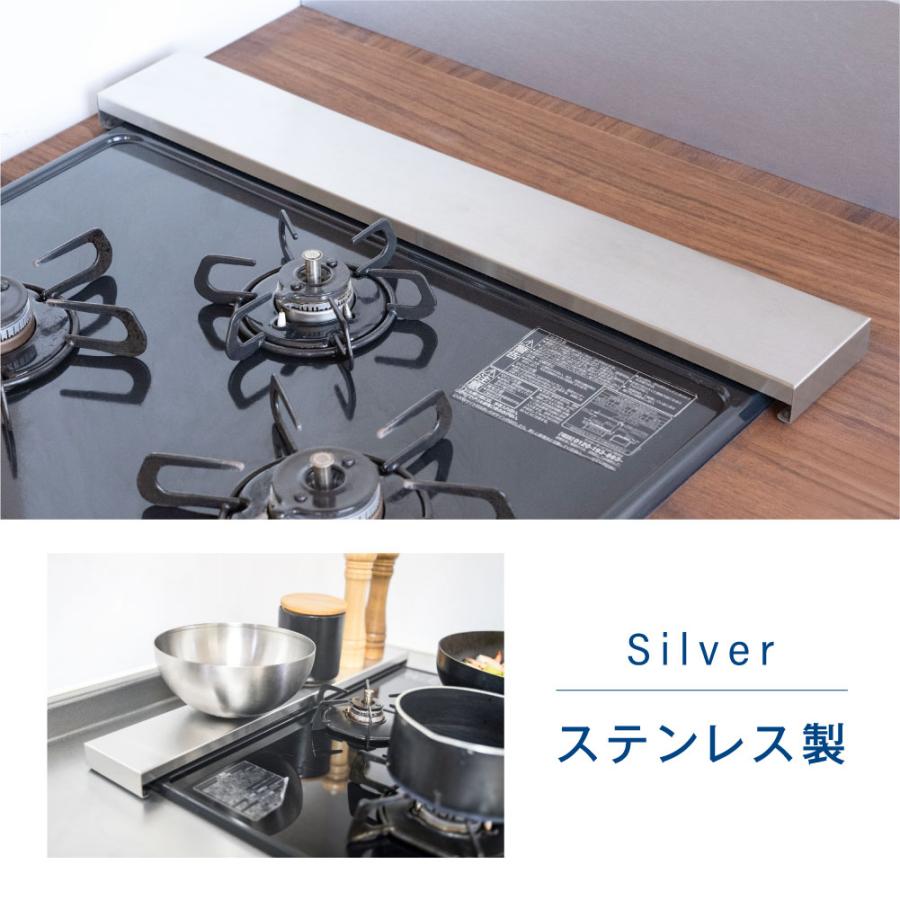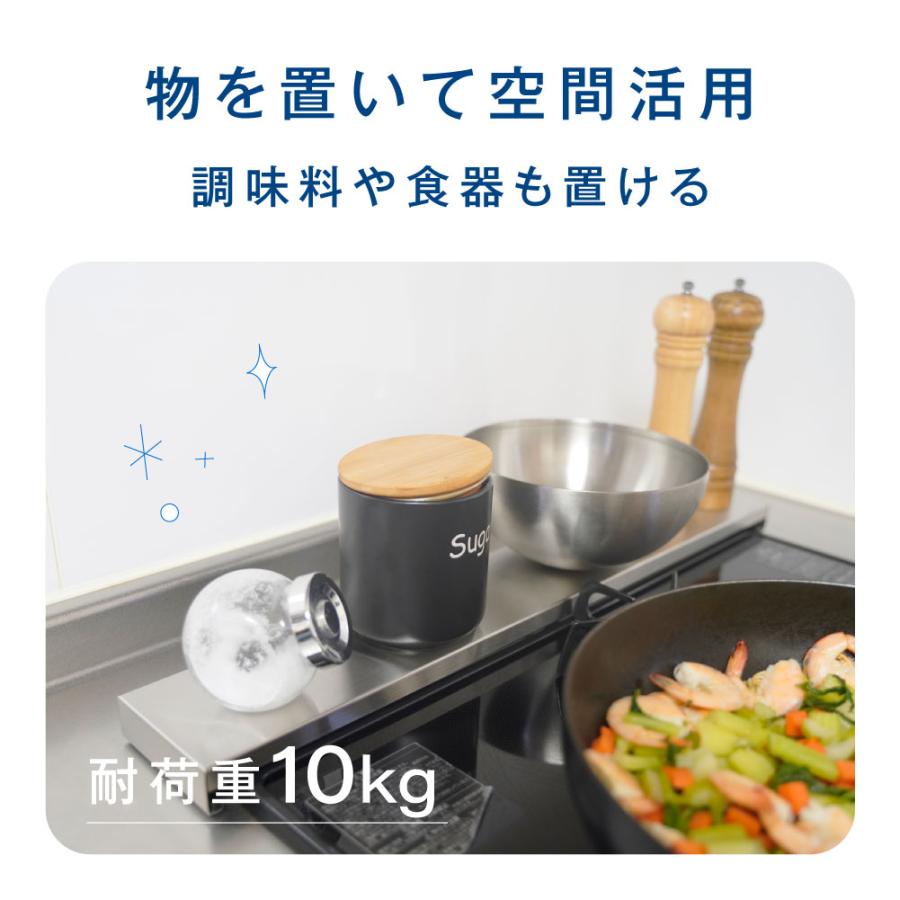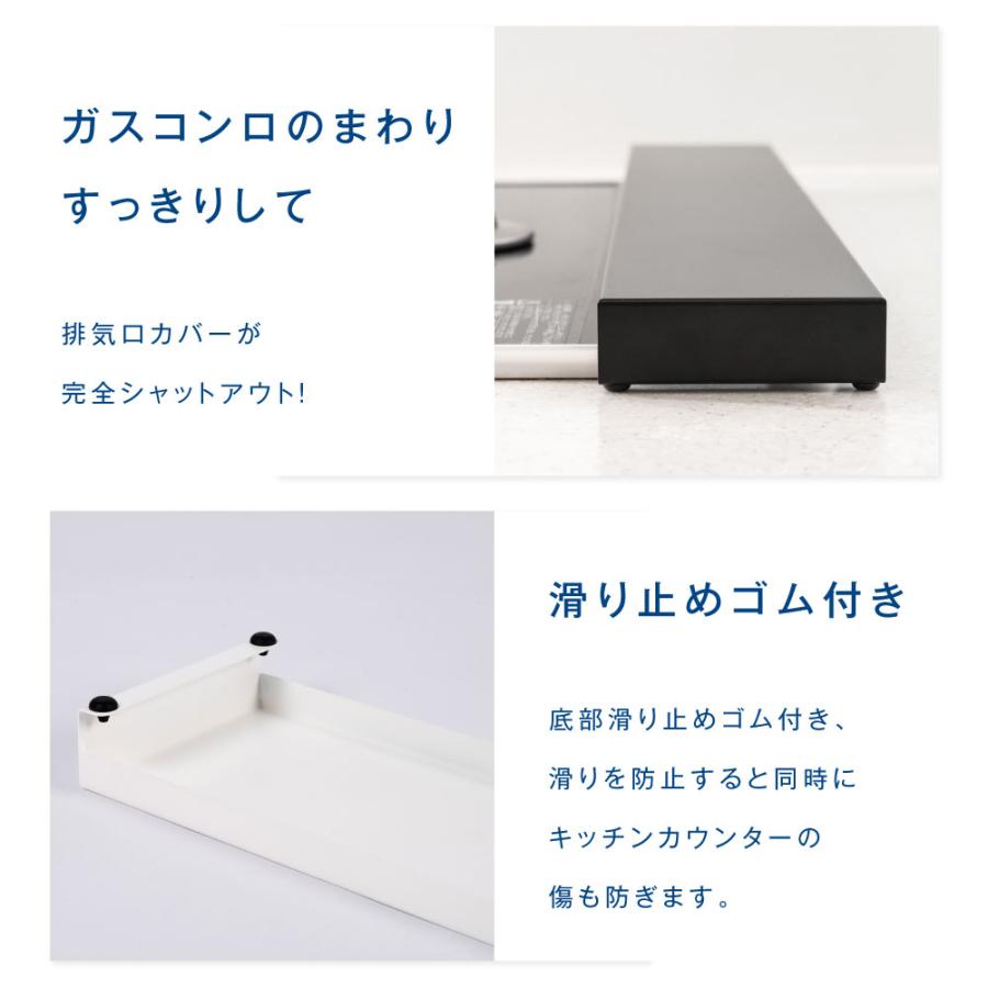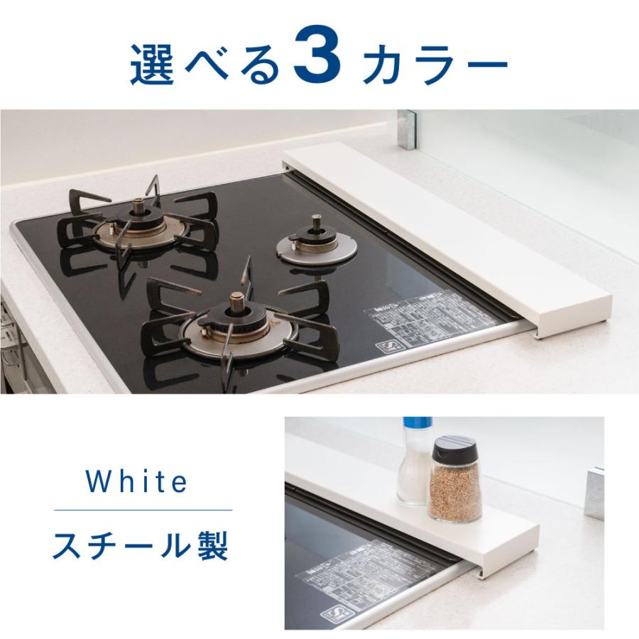 【コンロ奥を収納ラック】調味料置きなど、コンロ 周りを広く使えます。フラットなカバーの上は収納にも活 デッドスペースになりがちなコンロを有効活用できます。滑りを防止すると同時に キッチンカウンターの側も防ぎます。