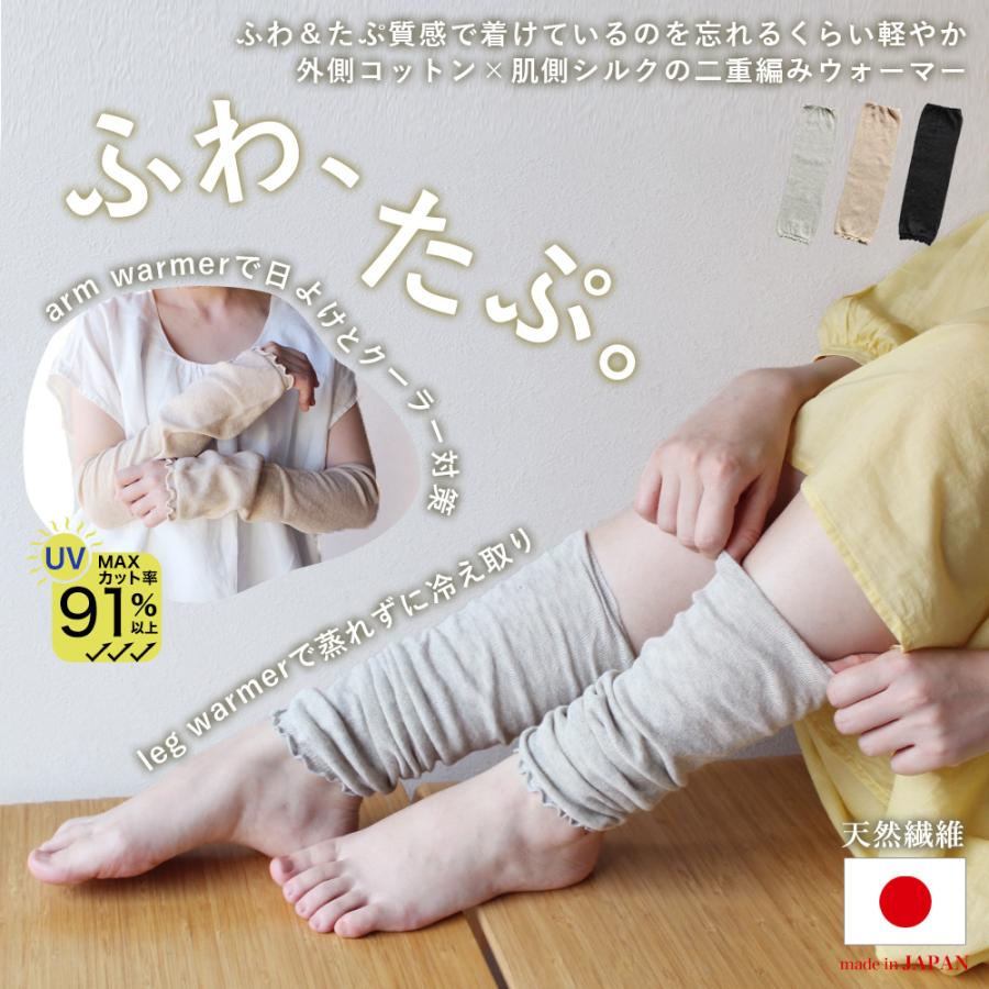 【商品説明】天然繊維シリーズから表に綿、内側に絹を使った二重編みのレッグウォーマーが登場です。絹は絹紡糸を使用したスベスベ感&着け心地はさらっとして肌に張り付きません。ふんわり軽い仕上がりと、レッグ幅は約11cmと広めでたぷっとした作りなので風を通して涼しいです。幅が広め&両端の締め付けも少ないのでアームカバーとしてもお使いいただけます。