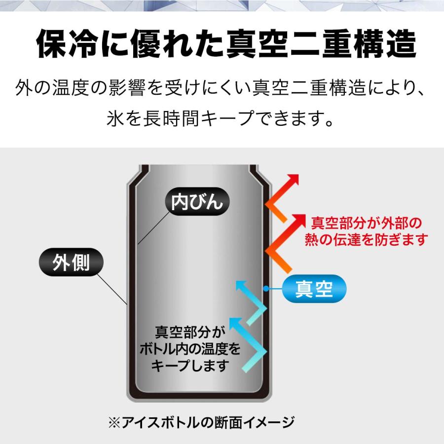外の温度の影響を受けにくい真空二重構造で氷を長時間キープ。実験では室温22〜24度の環境で48時間後にもロックアイス(バラ氷)が残るほどの保冷力を実証しました。