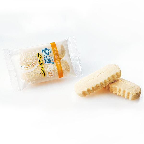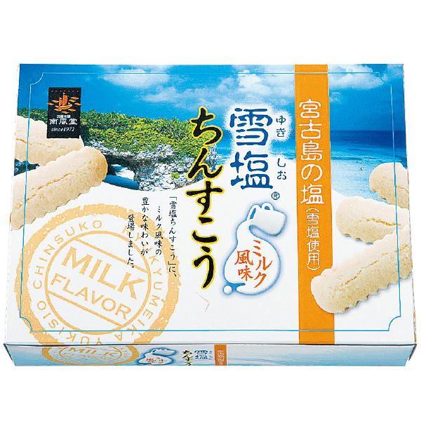 沖縄の伝統菓子「ちんすこう」と、沖縄の自然が育んだ宮古島の雪塩を組み合わせた逸品です。是程良いミルクの風味が好評。甘いもの好きの女性や若い人に人気です。