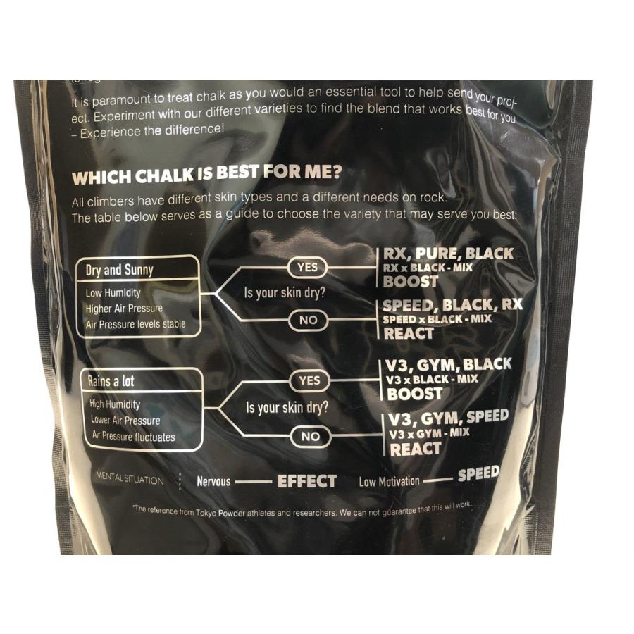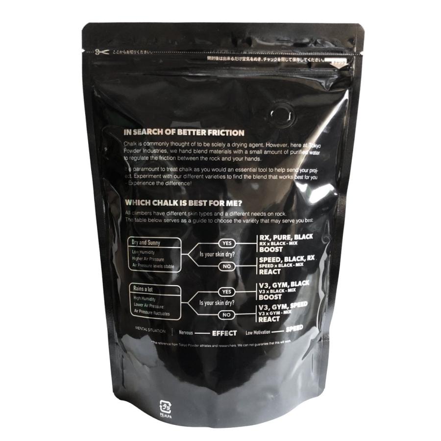 特に対花崗岩においてその性能を発揮する特徴があります。密着性の高いBLACKは手に付着する量が?多く、チョークが手に付くスピードも抜群。チョークアッフ?の困難なハードルートにおいては一瞬で手にのる特性と持続力が高評価で?す。