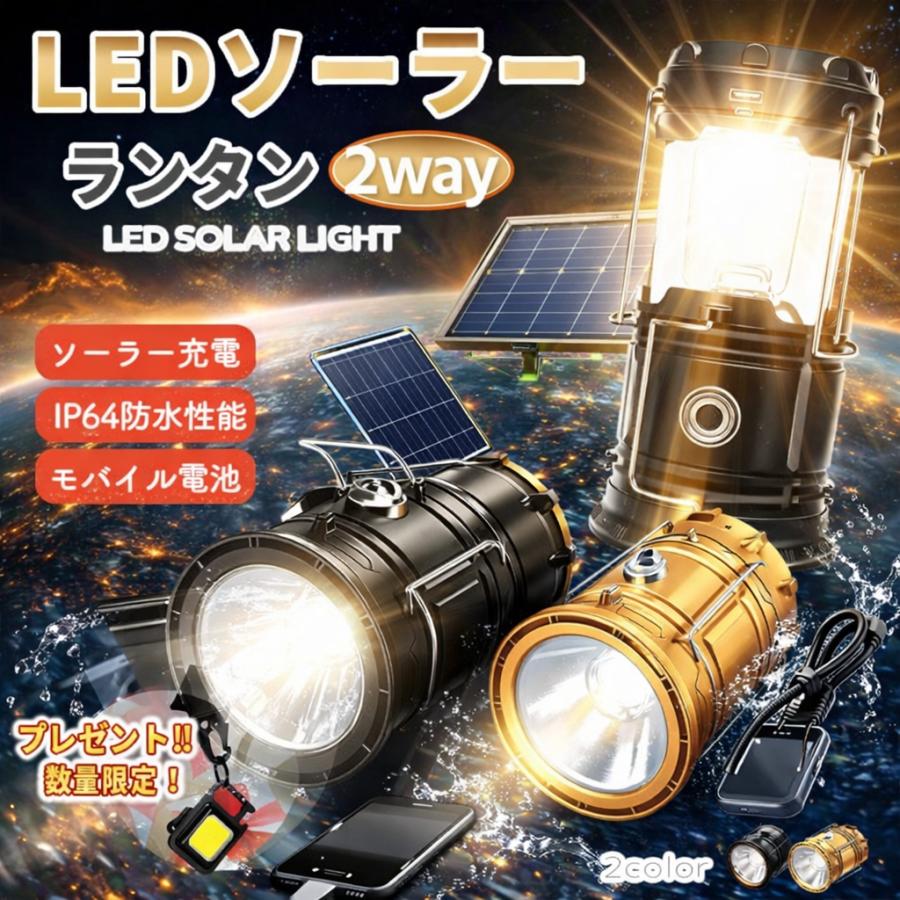 USBとソーラー充電に対応したIP64防水の2WAY LEDソーラーランタン。360度全方位を明るく照らすします。