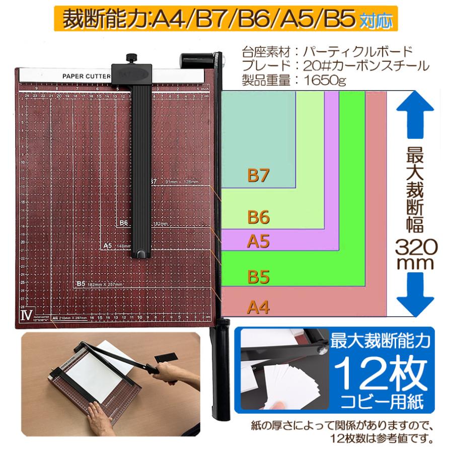 【製品仕様】製品サイズ:500X260X40mm、重量:1.65Kg、切断可能サイズ:320X250mm、ペーパーカッターの適用可能な切断範囲:A4、A5、B5、B6、B7