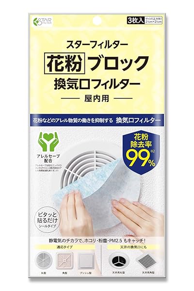 花粉ブロック換気口フィルター アレル物質抑制 貼るだけ カバー不要 21x21cm 3枚入 スターフィルター 吸気口 給気口 黄砂 PM2.5