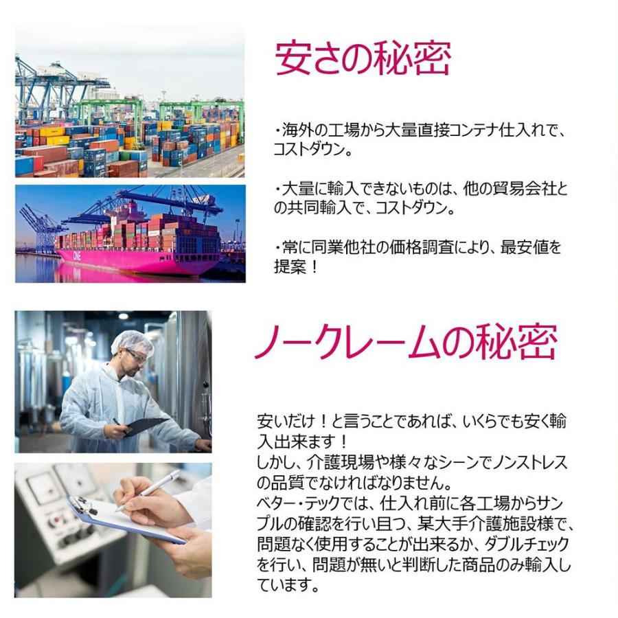 ベター・テックでは、仕入れ前に各工場からサンプルの確認を行い且つ、某大手介護施設様で、問題なく使用することが出来るか、ダブルチェックを行い、問題が無いと判断した商品のみ輸入しています。