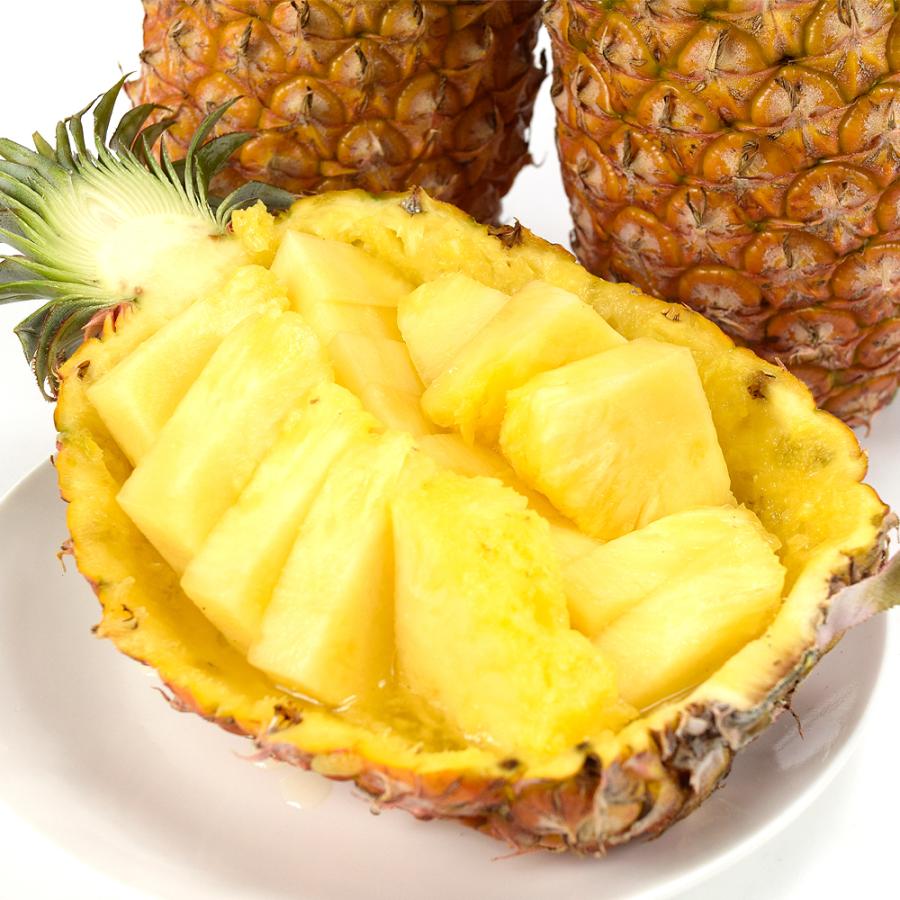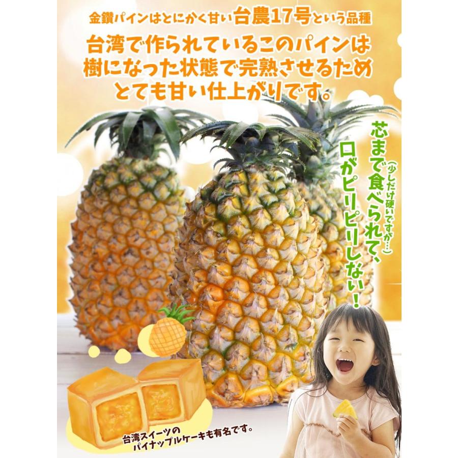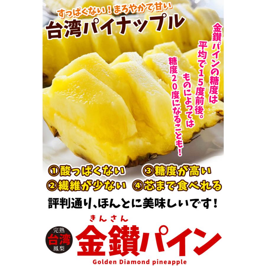 ●商品情報:「金鑚パイン」は酸味や繊維が少なく芯まで食べられる大人気パイナップル!口の中がピリピリしないので、パインの刺激が苦手な方にもとってもおすすめです。完熟収穫でなんとメロン並みの高糖度に!●産地:台湾●規格・サイズ:-●入数の目安:5kgあたり3〜4玉●配送形態:段ボール箱●配送温度:常温便●備考:※ご家庭用としてご用意いたします。多少の傷・変形果等はご了承ください。●送料:通常配送:送料無料北海道・沖縄:1箱(組)ごとに1500円