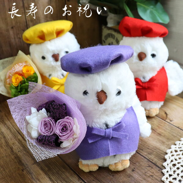 かわいいフクロウのぬいぐるが、長寿祝いカラーのちゃんちゃんこを着ています。 そんなかわいいふくろうに、プリザーブドフラワーの花束(ミニブーケ)をセットしました。 還暦祝いの赤、古希・喜寿・卒寿の紫、米寿・傘寿の黄色の3色をご用意しました。 おしゃれな箱にお入れしてラッピングしてお届けします。 ■還暦祝い(満60歳) 還暦のお祝いは「赤ちゃんに還る」「厄除け」という意味合いから、赤いちゃんちゃんこなどを着てお祝いしたりします。「赤色」のものを贈ってお祝いします。 ■古希(70歳)・喜寿(77歳) 基本的に「紫色」のものを贈ってお祝いします。 ■傘寿(80歳)・米寿(88歳) 基本的に「金茶色」「黄色」のものを贈ってお祝いします。傘寿は「紫色」で祝う場合もあります。 ■卒寿(90歳) 基本的に「紫色」のものを贈ってお祝いします。長寿祝いでもっとも多く使用されているのが紫色になります。 「ちゃんちゃんこ」はちょっと…と思われる方も多いかと思います。 そんな方におすすめな赤いちゃんちゃんこをきた、ふくろう。 両親や祖父母に感謝や労いの気持ちをメッセージに添えて、フクロウと一緒におくりませんか? フクロウも縁起がよい動物として知られてますよ。 ※フクロウは話しません。 フクロウサイズ:約H13×W22×D10cm ブーケサイズ:約直径7cm プリザーブドフラワー:バラ、アジサイ |
