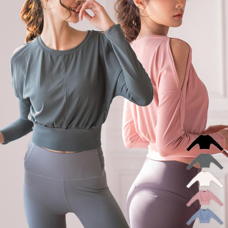 メール便送料無料 ヨガウェア 長袖 トップス レディース ヨガトップス クロップド丈 ピラティス ウェア 無地 ラウンドネック ウエストマーク