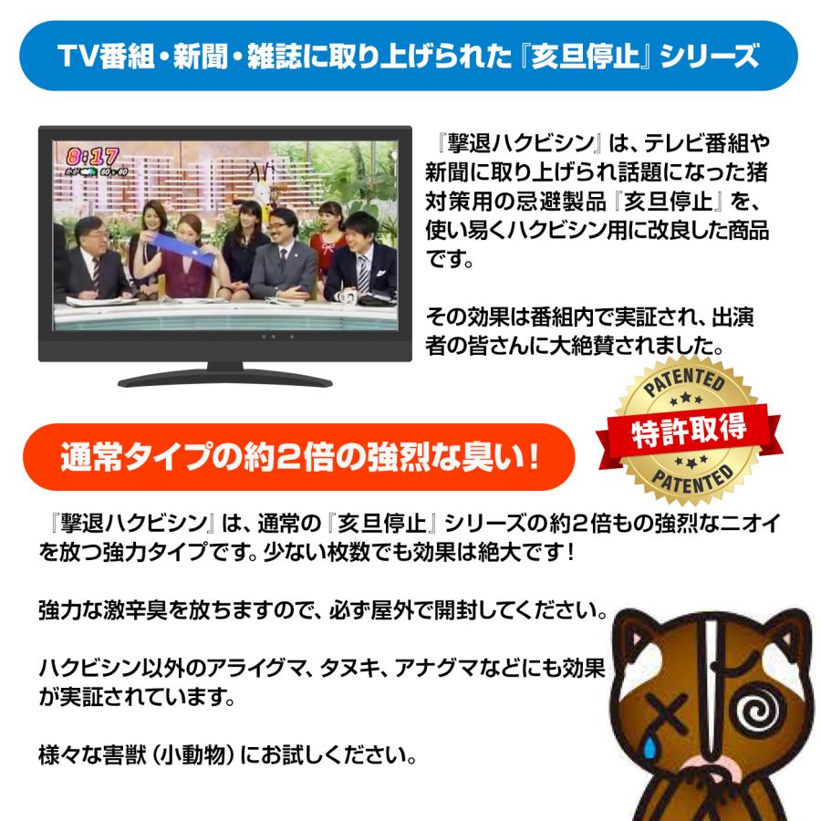 通常タイプの約2倍の強烈な臭い!『撃退ハクビシン』は、通常の『亥旦停止』シリーズの約2倍もの強烈なニオイを放つ強力タイプで、少ない枚数でも効果は絶大です!ハクビシン以外のアライグマ、タヌキ、アナグマなどにも効果 が実証されています。※注:強力な激辛臭を放ちますので、必ず屋外で開封してください。