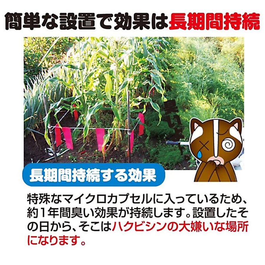 長期間効果が持続!特殊な微細マイクロカプセルに入っているため、約1年間効果が持続します。設置したその日から、そこはハクビシンの大嫌いな場所になります。