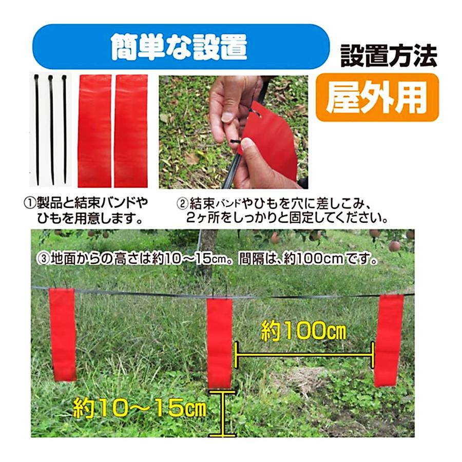 簡単な設置!結束バンドや紐などで、既存の柵やロープに吊るしたり、誰でも簡単に設置できます。