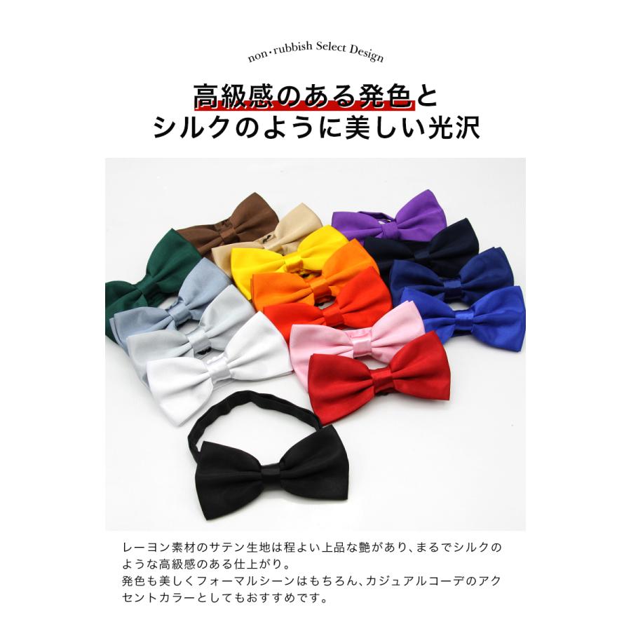 【フック式でカンタン着脱。無地蝶ネクタイ】程よい艶があるレーヨン素材のサテン生地を用いた蝶ネクタイ。結婚式の新郎様にも発表会のお子さまにも、衣装用として広くご支持をいただいております。フォーマル、カジュアルコーデに映える光沢アクセントを全18カラーからお選びいただけます。■素材レーヨン※商品画像のブラックケースは付属しておりません。
