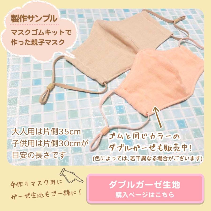 ゴムと同系色のダブルガーゼも別売り販売中なので気分をかえて色々な色で作って楽しんでください♪