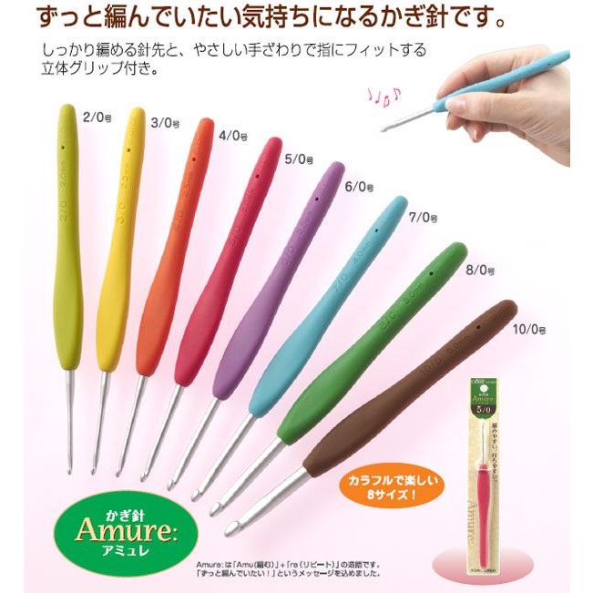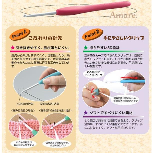 しっかり編める針先と、やさしい手ざわりで指にフィットする立体グリップのかぎ針です。