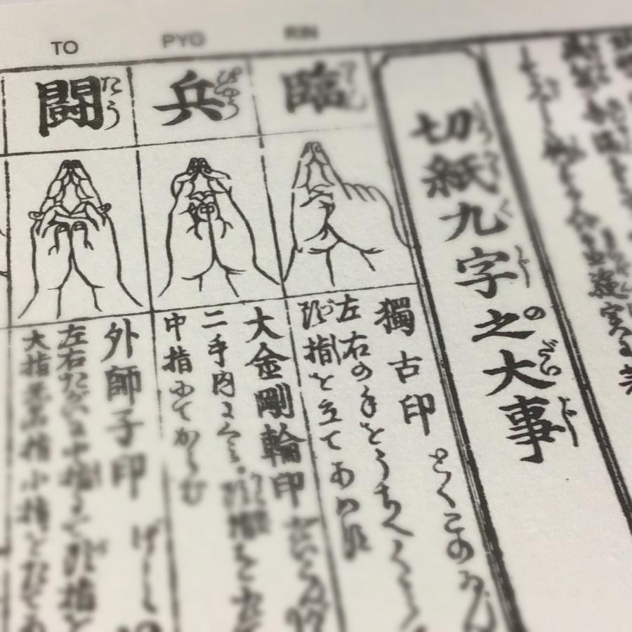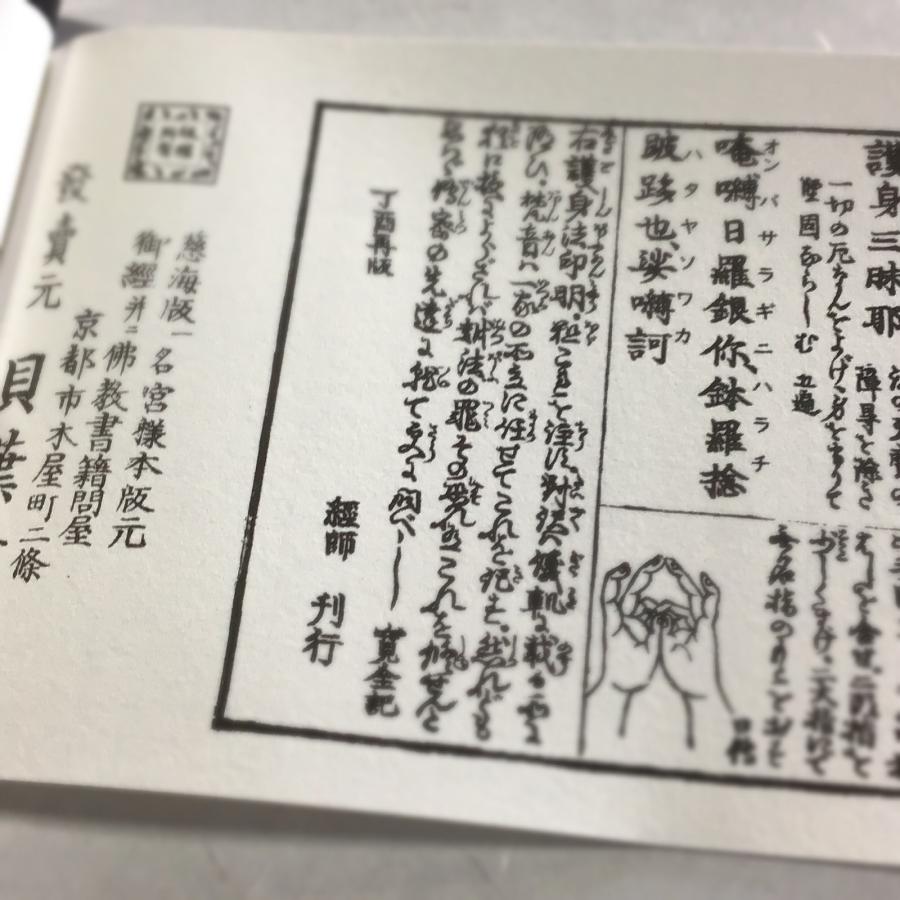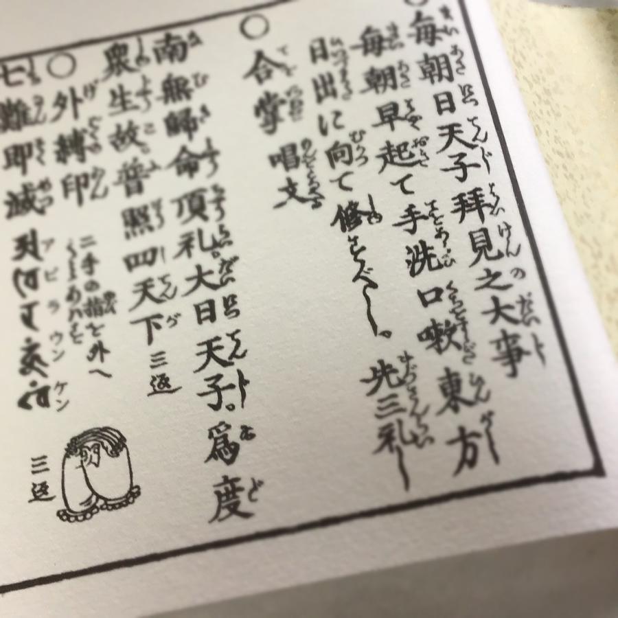 約100年前の【資料在庫4】護身法印明 寛全和尚記 平仮名付 小形 図入 より印刷、梵字にカナをふり、九字にはローマ字を追加しました。発送の際は、巻物をプラスチックケースから出しケースを畳んで平らにして(写真6枚目参照)梱包・発送します。ご希望数に足らない場合、ご注文前にお気軽にお電話やEmail等でお問合せ下さいませ。オンライン在庫の他に店頭在庫があることもございます。