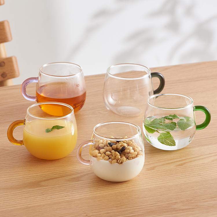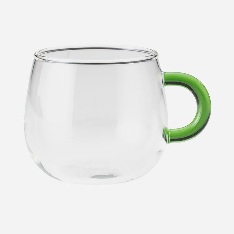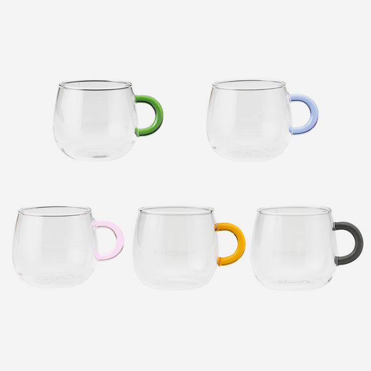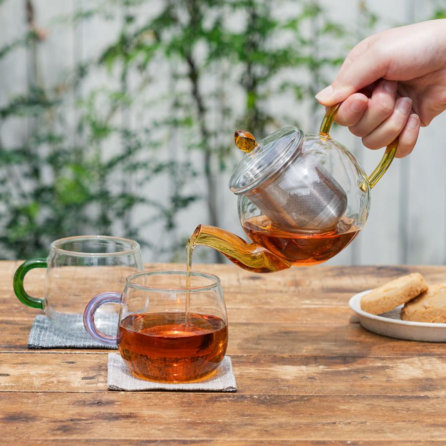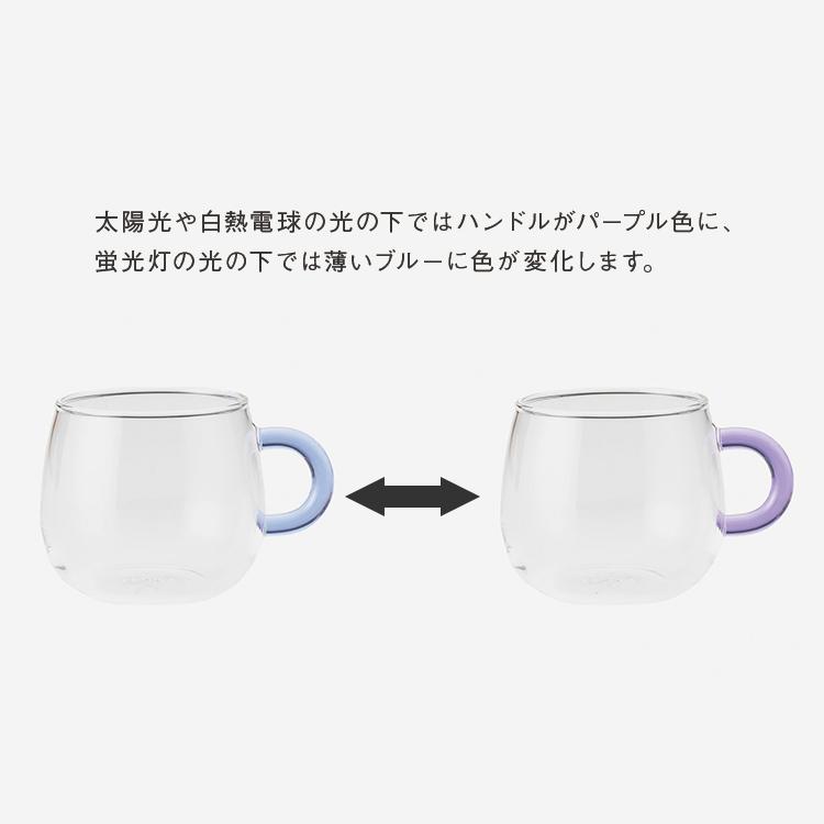 ティータイムを楽しく彩る、丸みのあるフォルムが可愛らしいティーカップシリーズです。電子レンジ使用可〇食器洗い乾燥機使用可〇※「パープル/ブルー」のみ、太陽光や白熱電球の光の下ではハンドルがパープル色に、蛍光灯の光の下では薄いブルーに色が変化します。サイズ:W10.2×D7.8×H7cm/適正容量=200ml/満水容量=260ml/重量=約90gカラー:イエロー、グレー、ピンク、グリーン、パープル/ブルー材質:耐熱ガラス生産国:中国検索タグ:ポイント利用 expoint01