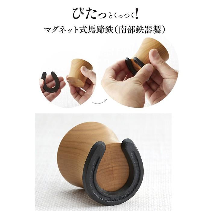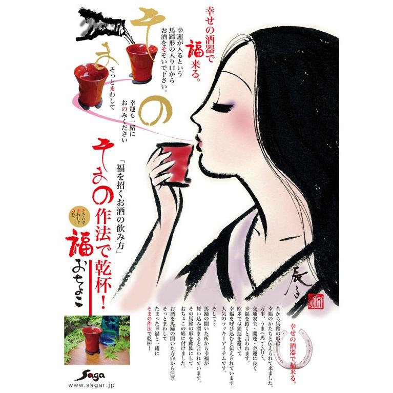 昔から馬蹄の形は幸福のかたちと伝えられて来ました。万事、うま(馬)く行く。交通安全・開運・金運に良く幸福を招くと言われます。欧米では悪運を避けて幸福を呼び込むと伝えられています。そしてその幸福は馬蹄の開いた所から舞い込み溜まると言われています。 その馬蹄の形を蹄鉄にしておちょこの底に取り付けました。マグネットで脱着可能ですので、洗う時にも簡単です。お酒を馬蹄の開いた方向から注ぎ、そっとまわして、たまった幸福と一緒に頂いてください。 ※このおちょこは、「握り」の加工はされていません。 誕生日プレゼント 結婚祝い 出産祝い 内祝い 退職祝い 長寿祝い 入学祝い 就職祝い 記念品 に!