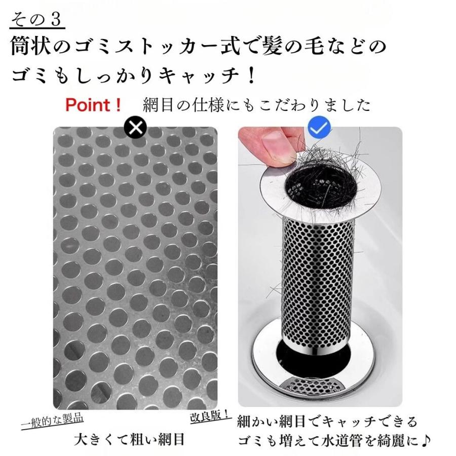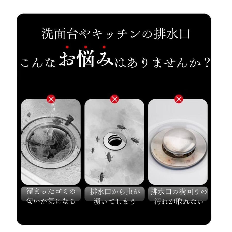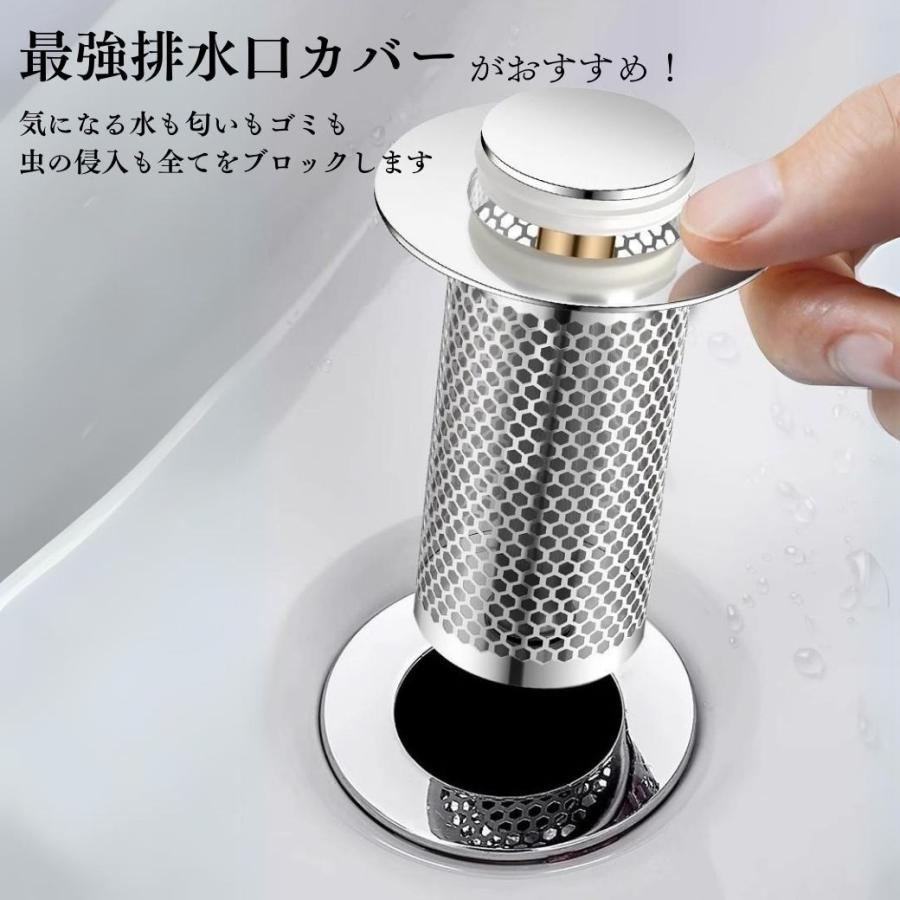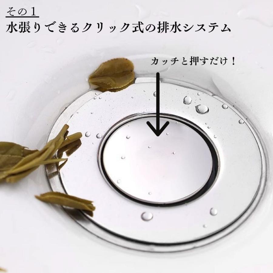 ・特徴:ステンレス製の詰まらせない排水口カバー。ワンクリックの密閉式で水を張ったり、匂いや虫の侵入を防ぐことができます。縦に伸びたゴミストッカー式で髪の毛やゴミが入っていても詰まらせずに水を流すことができます。掃除をする回数を減らすことができるので、家事も楽になりいつでも綺麗に洗面台を使うことが可能です。