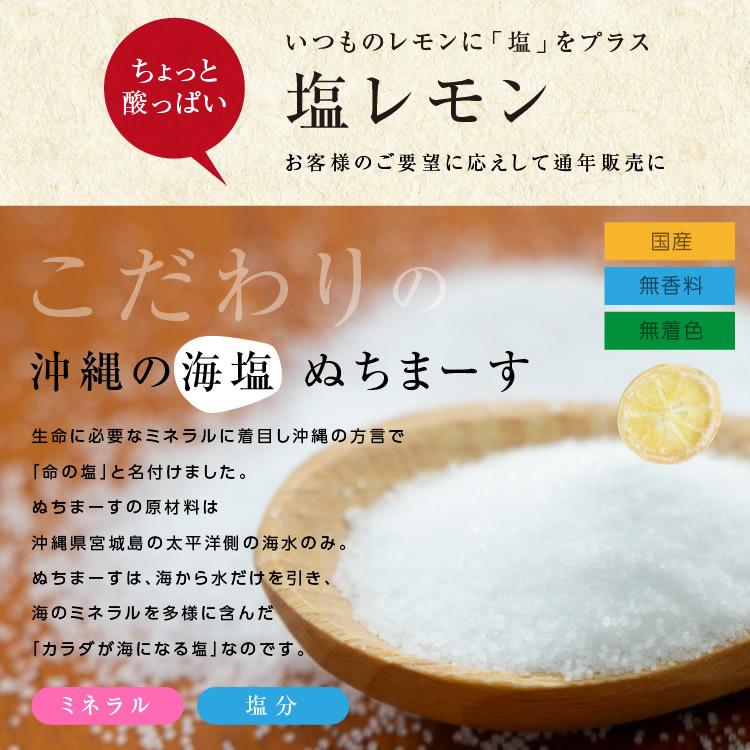 ●塩レモン:レモン(国産)、砂糖、還元水あめ、ぶどう糖、食塩/トレハロース、クエン酸、ビタミンC、乳酸Ca、酸化防止剤(酸素処理ルチン)