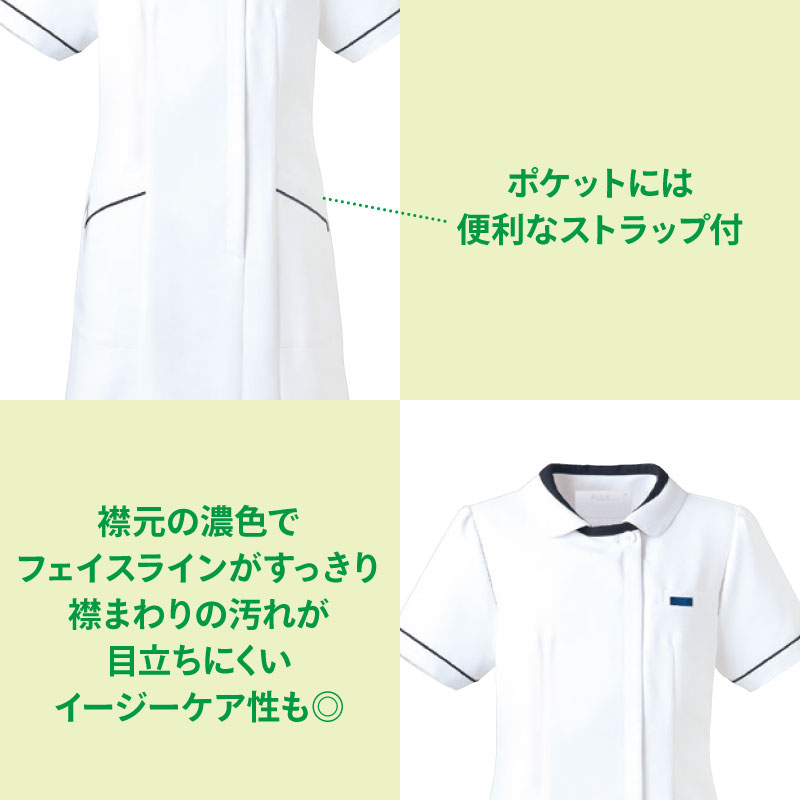 襟元に濃色で小顔効果があり、汚れが目立ちにくいデザインのワンピースです。