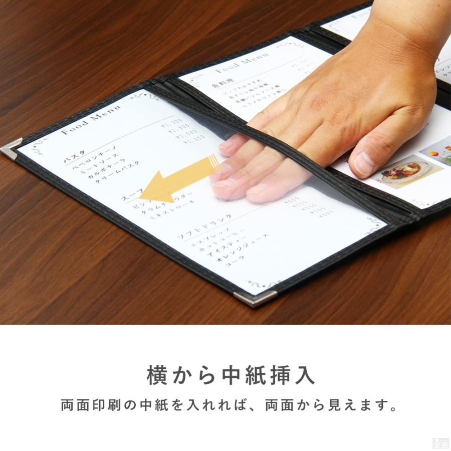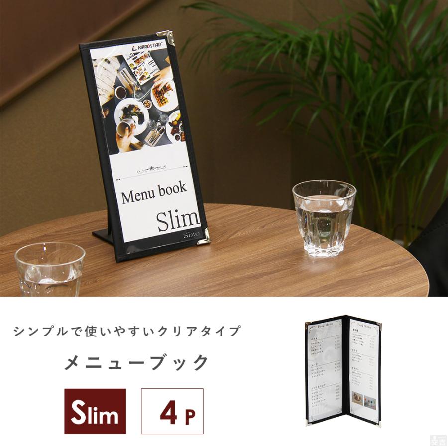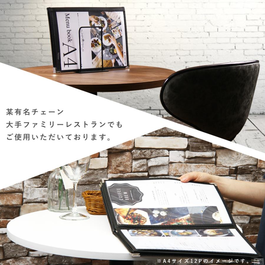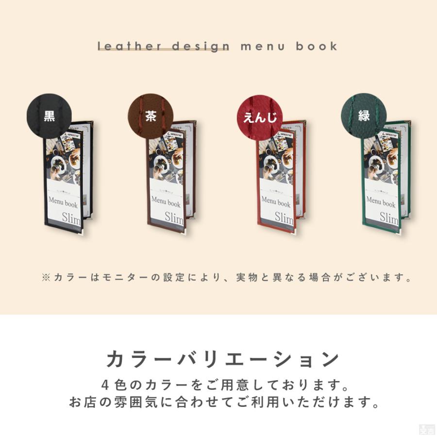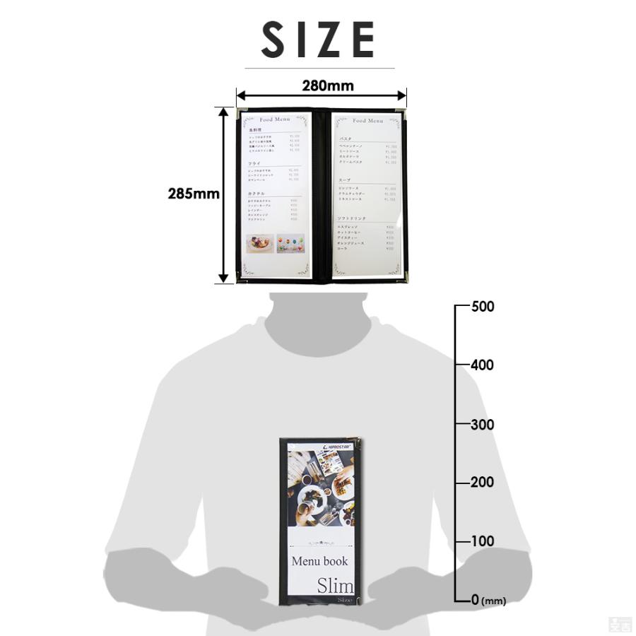商品説明メニューブック【形式】PRO-MS-4【対応中紙サイズ】115mm × 265mm【外寸】約 280 × 285【ページ】4ページ(2枚4面)【重さ】80g【厚み】背表紙側 約10mm 背表紙反対側 約6mm【材質】PET【カラー】黒/緑/えんじ/茶※当配送方法は同梱、代引き、時間指定不可(ポスト投函)となります。※他の商品と同時にご注文頂いた場合には送料が発生致します。