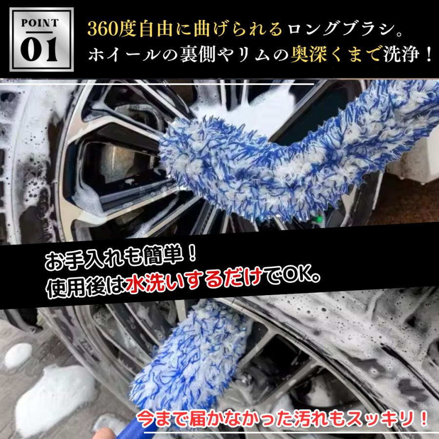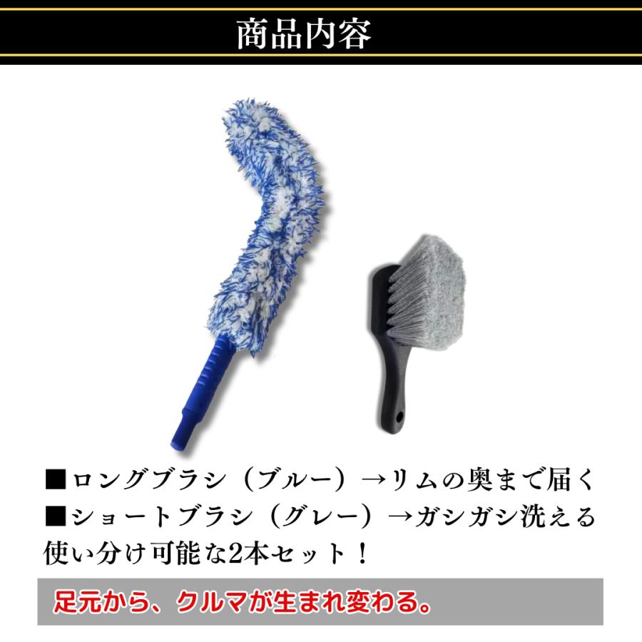 自由自在に曲がるロングブラシ&コンパクトなタイヤブラシを2本セットでお届けします。
