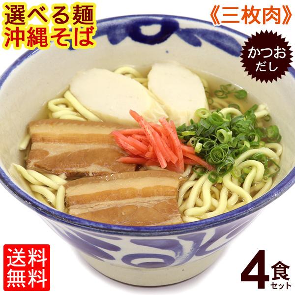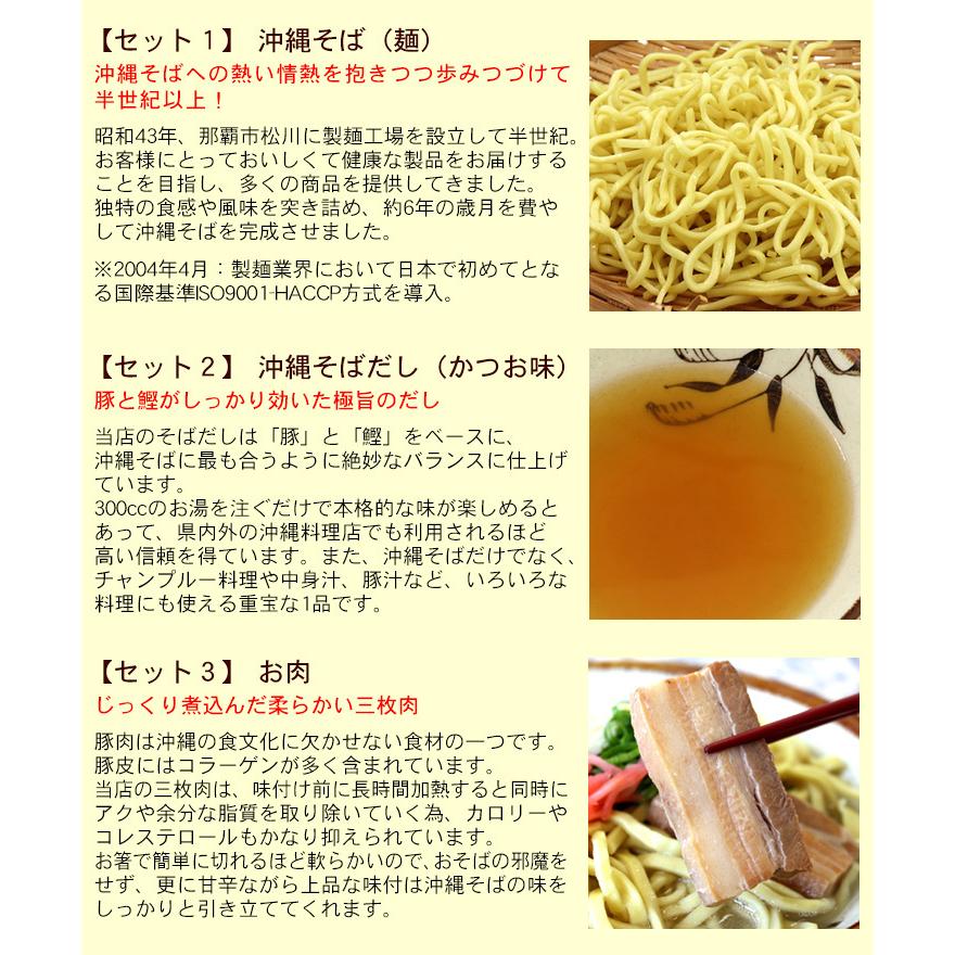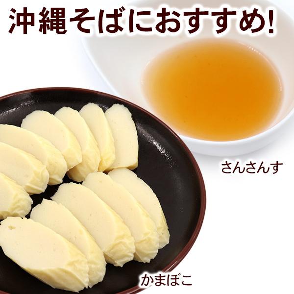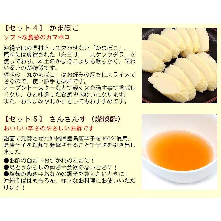 ■セット内容:麺4食分、沖縄そばだし鰹4P、味付け三枚肉2枚入×4P、丸かまぼこ170g×1本、さんさん酢4P
