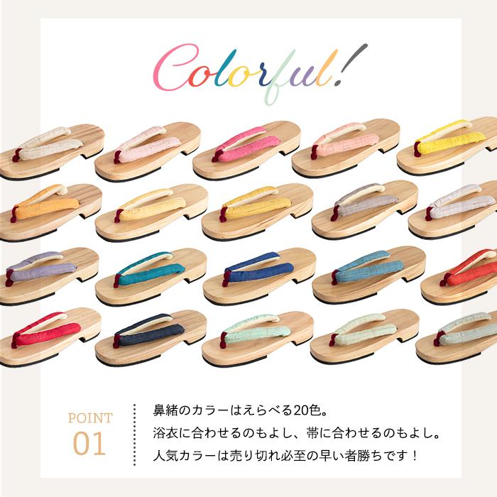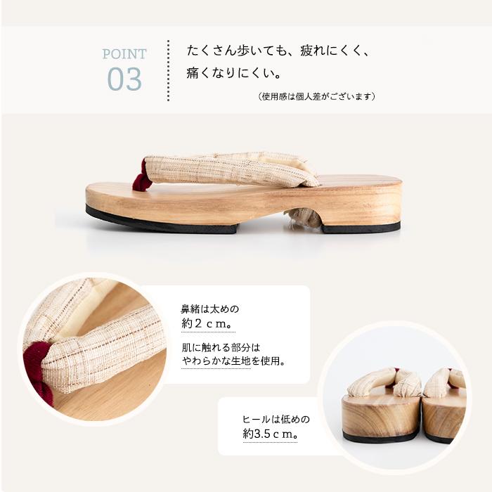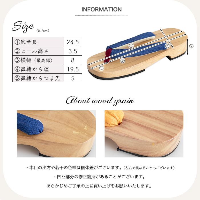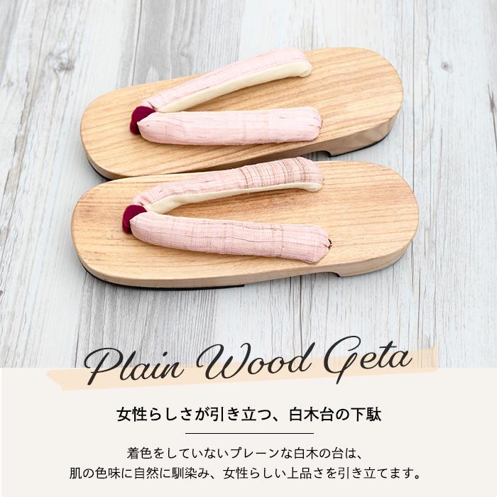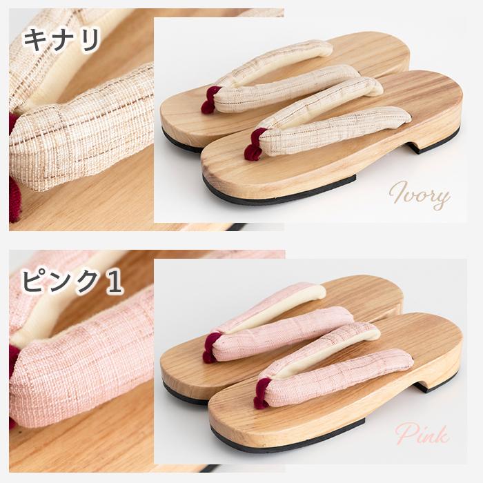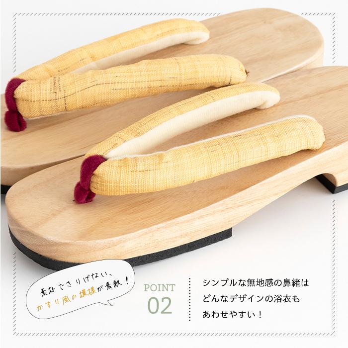 女性用の下駄です。白木台は気品あるで落ち着いた色味で、女性の魅力を引き出します。また焼桐台などに比べ高級とされています。鼻緒はざっくりとした麻生地の無地。主張しすぎずどんな浴衣にも合います。たくさんのカラーバリエーションがありますので、お好みのお色をお選びください。素材鼻緒表側 麻100% /鼻緒裏側 ポリエステル/下駄台 桐生産国鼻緒生地 日本/製造 中国サイズ24.5cm配送宅配便