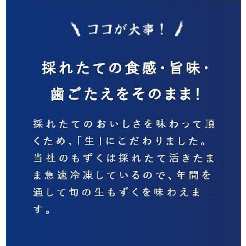 当社のもずくは採れたて活きたままを急速冷凍しているので年間を通して旬の生もずくを味わえます!採れたての食感・旨味・歯ごたえをそのままに!