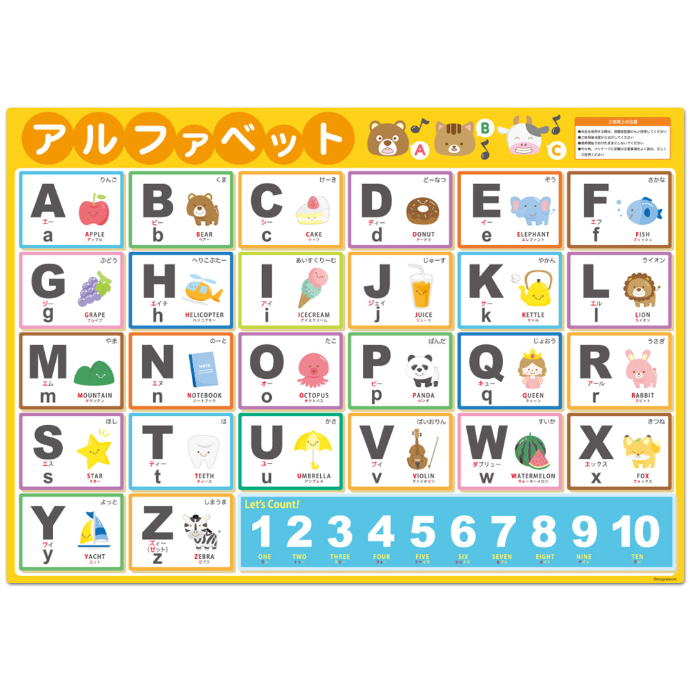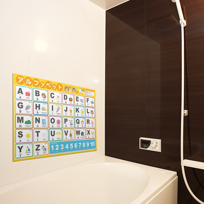 おべんきょうの最初の一歩に!お風呂で使えるおふろポスターのうち「あいうえお表ポスター」「アルファベット表ポスター」「すうじ表ポスター」のポスター3点をセットにしました。そろそろ文字や数字に興味を持ちはじめたかなと思ったら、まずはこの3つから初めてみては?