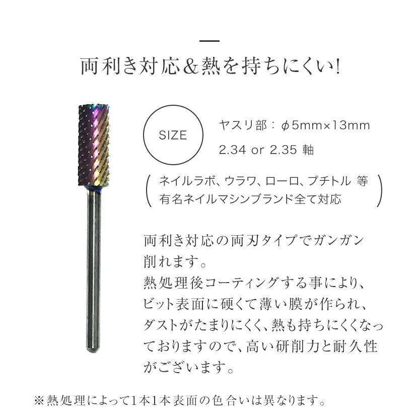 商品説明:両利き対応の両刃タイプでガンガン削れます。熱処理後コーティングする事により、ビット表面に硬くて薄い膜が作られ、ダストがたまりにくく、熱も持ちにくくなっておりますので、高い研削力と耐久性がございます。※熱処理によって1本1本表面の色合いは異なります。2.34 or 2.35 軸(あらゆるネイルマシンに対応)