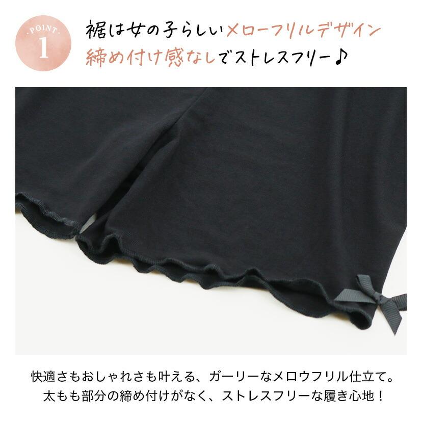 スカートやワンピース、ショートパンツの下に、または、幼稚園や小・中学校、高校の制服の下に履く、黒無地のベーシックなオーバーパンツ。