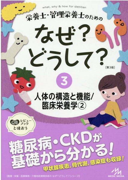 ★大人気シリーズが、さらに内容を充実させて3年ぶりに改訂!本書は、先生役の「スーパートマト」と、生徒役の「栄子」の会話からなる楽しいストーリーを読むだけで、国家試験にも対応できる知識が身につく大人気シリーズの改訂版です。リニューアルした3巻では、臨床栄養学を徹底的に分かりやすく解説! 栄養管理が治療の一貫として重要とされる糖尿病や慢性腎臓病(CKD)をはじめ、甲状腺疾患、骨代謝、感染症といった国試頻出テーマを丁寧に解説します。加えて、前版以降の疾患のガイドライン改訂にも対応しています!★管理栄養士国家試験の過去問を分析&専門の先生方のご監修で、内容が実践的!『なぜ?どうして?』シリーズは、ただ読みやすくて分かりやすいだけではありません。長年管理栄養士国家試験を分析し続けてきた『クエスチョン・バンク』制作チームが編集しており、国家試験の近年の傾向を十分把握した上で制作しています。そして、各分野のエキスパートの先生方にご監修をお願いしているので、国家試験の内容はもちろん、実際の臨床現場の実情も反映した内容となっています。★臨床栄養学の対策には『なぜ?どうして?』が効果的国家試験受験生の中には、「臨床栄養学は覚えることが多くて苦手」という人が多いです。一方で、「臨床栄養学は、実力を伸ばしやすい」という人もいます。この違いは、臨床栄養学の勉強の仕方にあります。臨床栄養学は、国家試験に出題された箇所を丸暗記するのではなく、解剖生理学や基礎栄養学、病態学などの科目の知識と関連付けて勉強することがお勧めです。『なぜ?どうして?』では先生役のトマトと生徒役の栄子の会話で、臨床栄養学とこれらの科目を関連づけて説明しているので、深い理解につながります。★別冊付録「Check it out ~国試にチャレンジ~」本書は読みやすくわかりやすいだけでなく、国家試験レベルの内容もカバーするように作られています。今回の新シリーズでは、別冊付録として実際の国家試験を掲載しております。本書の各話を読むと解けるようになるので、読んだ後に実際の国試を解いて、知識が身に付いているか確認することができます。