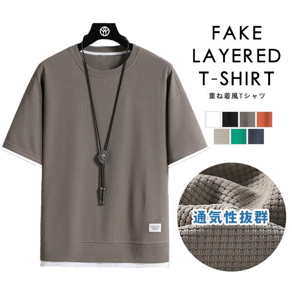 Tシャツ メンズ トップス 半袖 ゆったり 重ね着風 フェイクレイヤード ワッフル 通気性 涼しい クルーネック Uネック シンプル 無地 お洒落 夏 送料無料