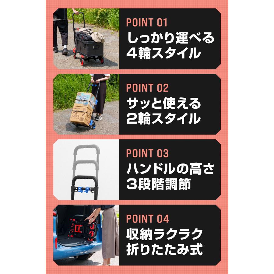 長いものや高さのあるものも運搬しやすい2輪カートスタイル。小回りがきくので買い物など日常使いでも活躍します。