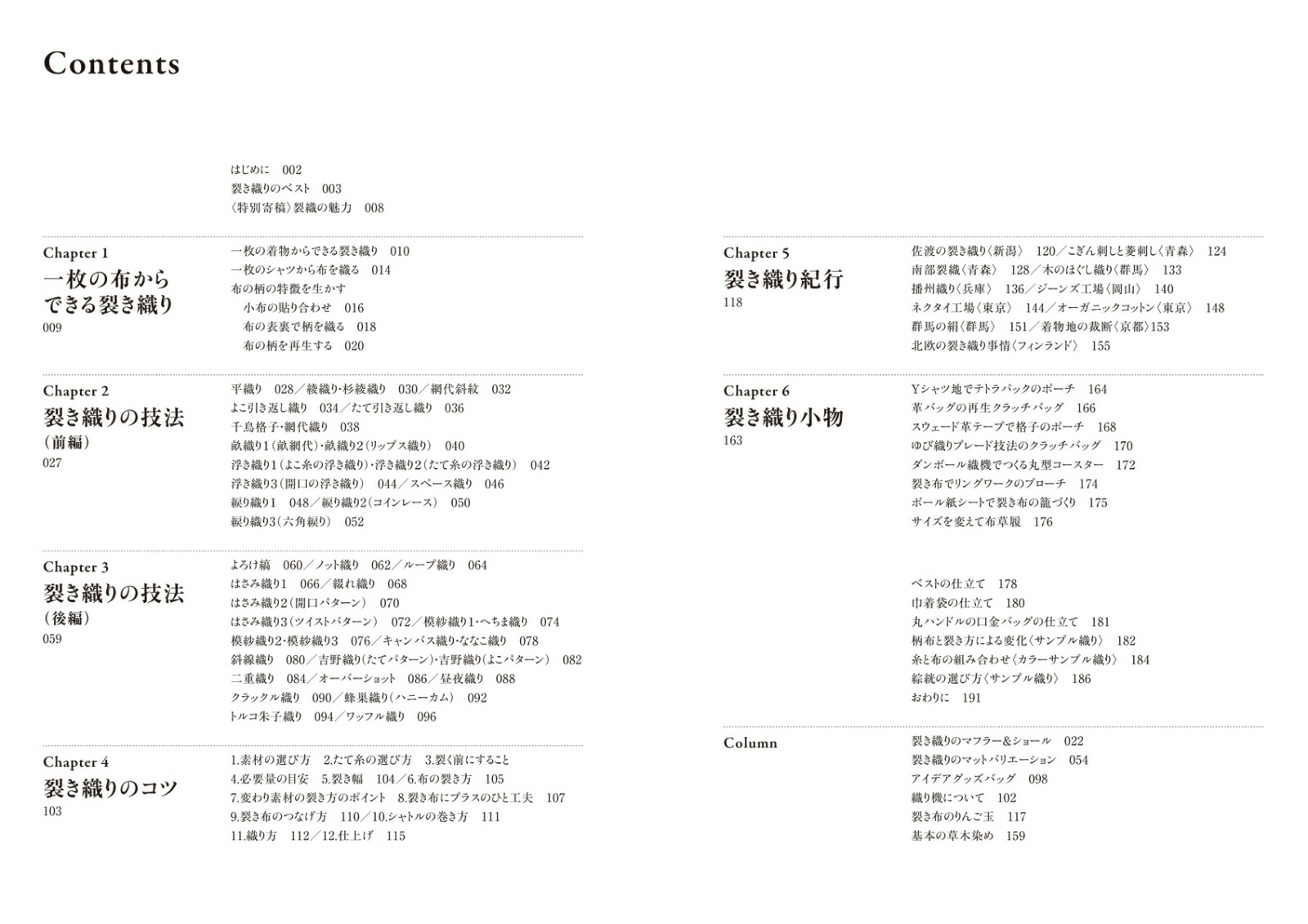 一枚の布からできる裂き織り(一枚の着物からできる裂き織り/一枚のシャツから布を織る ほか)/裂き織りの技法(平織り/綾織り・杉綾織り ほか)/裂き織りのコツ(素材の選び方/たて糸の選び方 ほか)/裂き織り紀行(佐渡の裂き織り(新潟)/こぎん刺しと菱刺し(青森) ほか)/裂き織り小物(Yシャツ地でテトラパックのポーチ/革バッグの再生クラッチバッグ ほか)