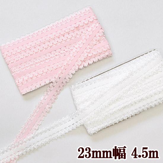 レース付きゴム 約23mm幅 約5ヤード#ゆうパケ12点可ふんわりで肌触りのよい、レースが両端についたゴム。お洋服の切り替え部分やゴムを伸ばしたまま縫うとギャザーになります。インナーの端に付けても、可愛らしい印象にヘアアクセサリーやポーチや小物のアクセント、お子様のお洋服衣装やドレスなどにもオススメです♪