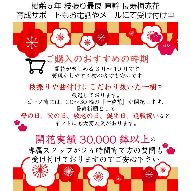 幹肌は古い樹の独特の味わいがあり、可憐で美しい一重紅花は咲かせる楽しみや、鑑賞時に心に安らぎや癒しを与えてくれます。