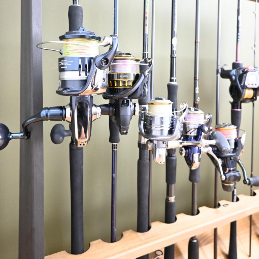 釣竿はリールを付けたままでも安定して立て掛けられます。