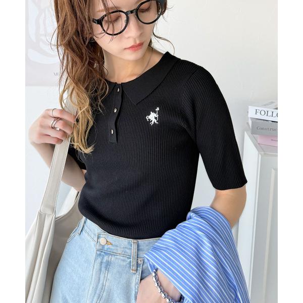 商品名:衿付きデザインが旬♪ワンポイント刺繍ゴールドボタン五分袖リブポロニットシャツ