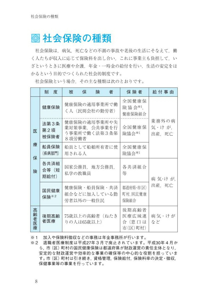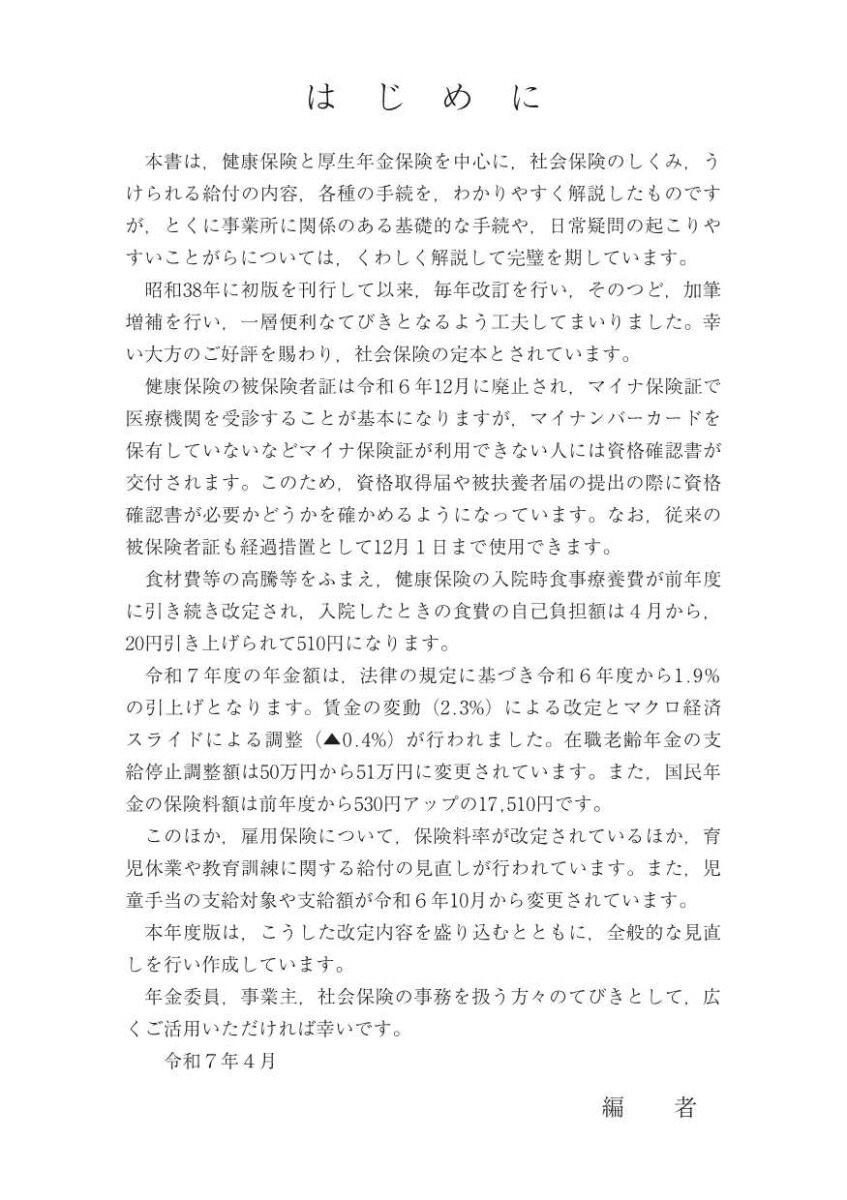 社会保険のしくみをくわしく解説健康保険・厚生年金保険を中心に社会保険のしくみと給付をくわしく、初心者でもわかるように解説した入門書です。健康保険の給付と年金給付(老齢給付・障害給付・遺族給付)をていねいに解説しました。【本書の構成】1 健康保険・厚生年金保険のしくみ 1.保険者 2.被保険者の資格取得 3.標準報酬(月額・賞与額)と保険料 4.被保険者の資格喪失 ■その他の基礎的な手続 ■国民年金への加入と第3号被保険者の手続 ■主な事務手続き一覧 ■電子申請による届出 ■e-Govを利用した電子申請2 健康保険の給付 1.保険による診療 2.療養費の支給 3.健康保険でうけられない診療 4.公費負担医療との関係 5.移送費・家族移送費 6.傷病手当金 7.出産をしたときの給付 8.死亡したときの給付 9.資格喪失後の給付 10.給付の制限・権利の保護など 11.自動車事故と社会保険 12.法第3条第2項被保険者のしくみ 13.法第3条第2項被保険者の給付 ■特定健康診査・特定保健指導の実施 国民健康保険/退職者医療制度/後期高齢者医療制度/介護保険3 年金給付 1.基礎年金・厚生年金給付の種類と通則的事項 2.老齢給付 3.障害給付 4.遺族給付 5.旧法による年金 6.併給の調整など 7.未支給の給付など 8.複数種別の厚年期間があるとき 9.企業年金 10.旧公企体・農林共済組合員の経過措置 11.年金受給者への融資事業 12.年金生活者支援給付金 児童手当/労働保険/年金委員・健康保険委員 ■日本年金機構・年金事務所・事務センター一覧 ■全国健康保険協会本部・支部一覧 ■街角の年金相談センター一覧 ■年金に関する電話での問い合わせ ■地方厚生(支)局一覧更新日:2025年05月02日
