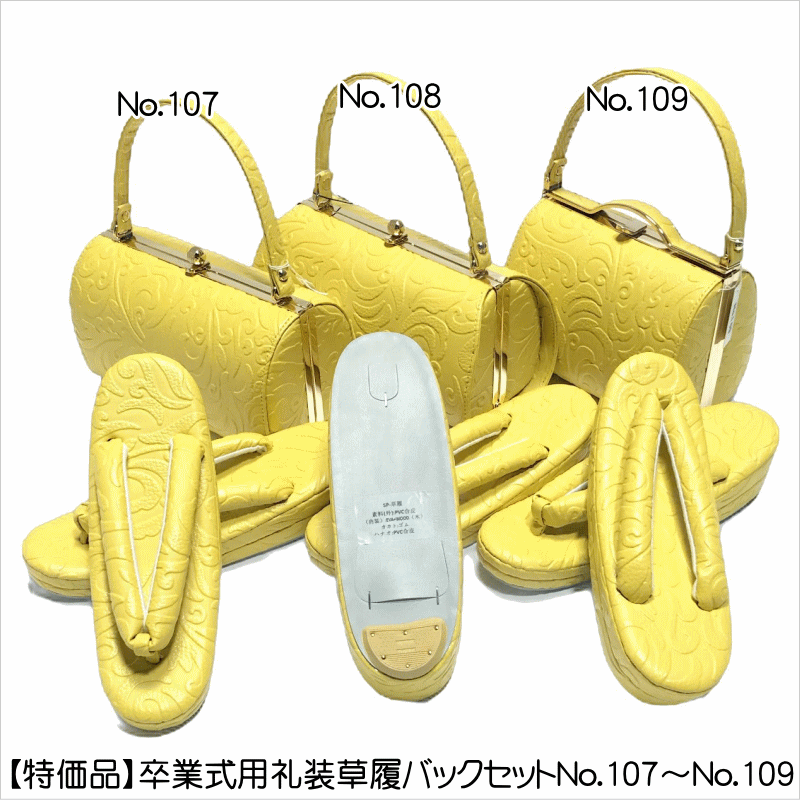ã€ç‰¹ä¾¡å“ã€‘å’æ¥å¼ç”¨ç¤¼è£…è‰å±¥ãƒãƒƒã‚¯ã‚»ãƒƒãƒˆNo.107~No.109 黄色系統 フリーサイズ è‰å±¥ã‚µã‚¤ã‚ºé•·ã•ç´„24.3cm 巾約8cm ã‹ã‹ã¨ç´„5.3cm æˆäººå¼ 振袖 çµå©šå¼ 礼装用 å’æ¥å¼ パーティー 礼装用 フォーマル 訪å•ç€ è‰²ç„¡åœ°ã€ã‚モノ仙臺屋ã®å’Œè£…å°ç‰©ç‰¹é›†ã€‘