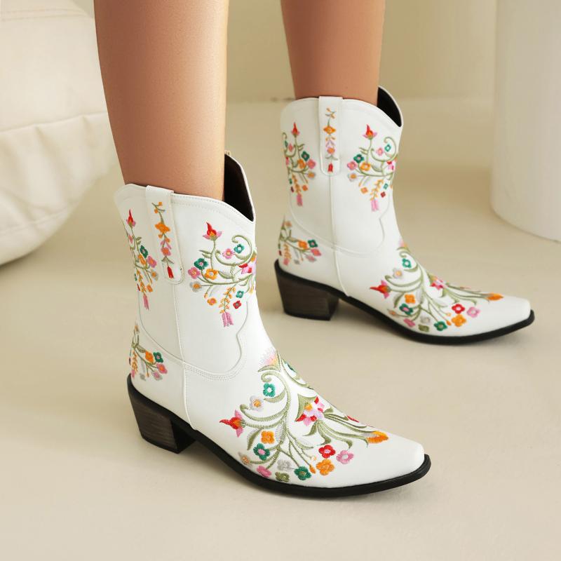 ウエスタンブーツ レディース ショート丈 大ãã„サイズ 秋冬 èŠ±æŸ„åˆºç¹ å¤ªãƒ’ãƒ¼ãƒ« プルオン フェイクレザー カジュアル アンクル丈 安定感 普段使ã„