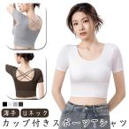 トップス カップ付ã ストレッムパッド付ã 響ã‹ãªã„ カップ付ã ショート丈 スãƒãƒ¼ãƒ„ 薄手 åŠè¢–tシャツ ブラトップ ä¸‹ç€ è‚Œç€ Tシャツ Uãƒãƒƒã‚¯ ヨガウェア ト