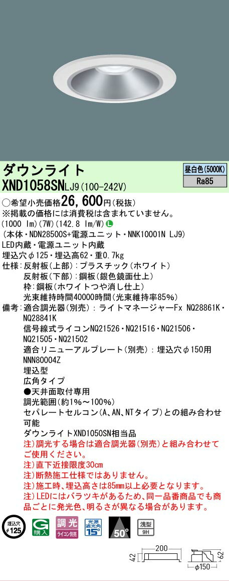 [法人é™å®š] XND1058SN LJ9 パナソニック 天井埋込型 LED 昼白色 ダウンライト [ XND1058SNLJ9 ]