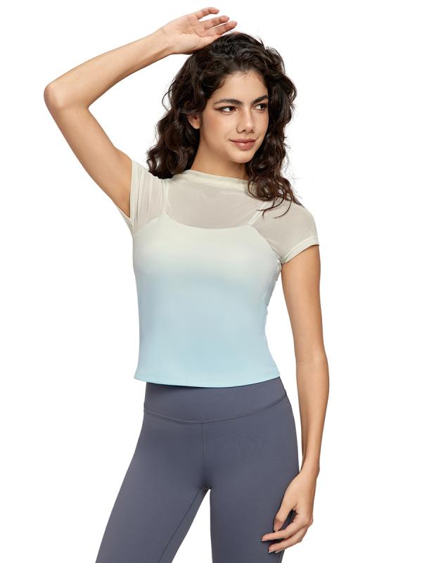 ヨガトップス レディース メッシュ åˆ‡ã‚Šæ›¿ãˆ é€æ°— åŠè¢– パッド入り セクシー タイトフィット ナイãƒãƒ³ 伸縮性 ピラティス フィットãƒã‚¹ é’ ãƒ”ãƒ³ã‚¯ ç·‘ オールシーズン