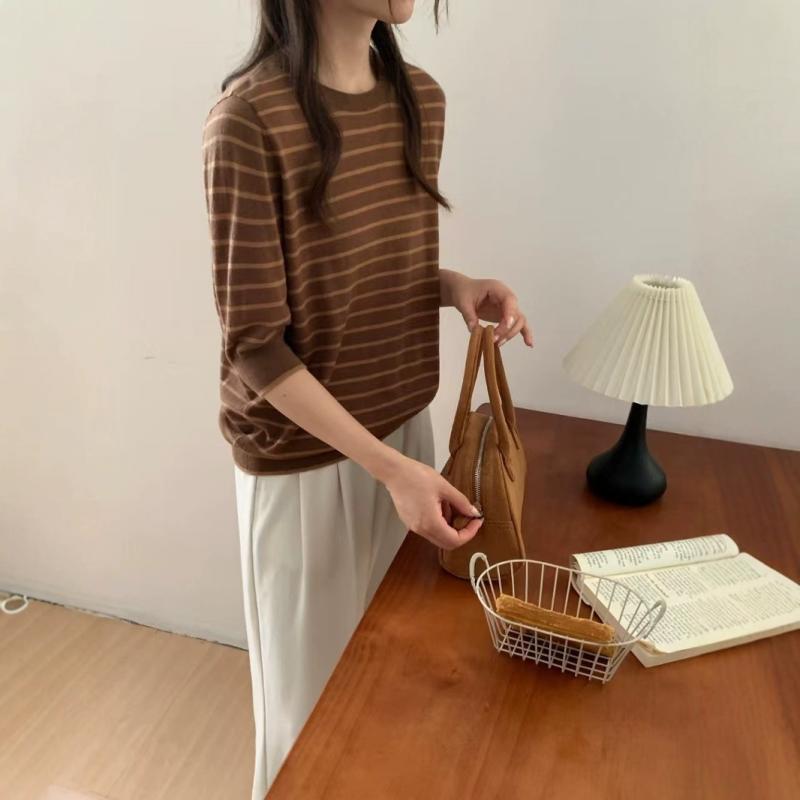 æ˜¥å¤ ãƒ¬ãƒ‡ã‚£ãƒ¼ã‚¹ çŸè¢– ニットトップス ストライプ柄 細羊毛 精紡 スリム百æ ファッション