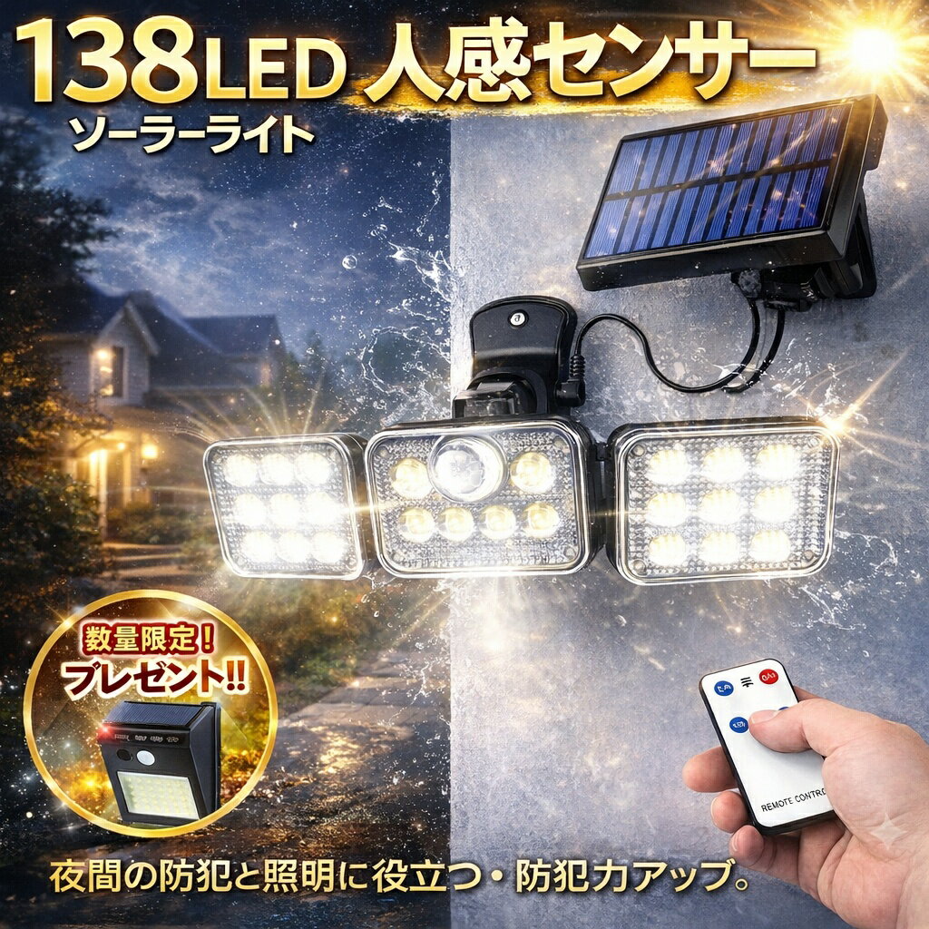センサーライト 屋外 led ソーラーライト 138LED 強力 IP65 防水 人感 å£æŽ›ã‘ åºƒç¯„å›² é˜²çŠ¯å¯¾ç– æ˜Žæš—ã‚»ãƒ³ã‚µãƒ¼ リモコン付ã 138ç¯ é˜²çŠ¯ç¯ çŽ„é–¢ ガーデン 角度調整 å……é›»å¼ ç°¡å˜è¨ç½® 3モード